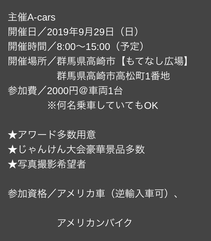 先日、9月29日(日) 第6回目のA-DAYが開催され、 群馬県高崎市【もてなし広場】に参加してきました😎🚗